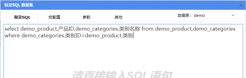 第三个数据集ds3从产品自带演示数据库中的“演示产品表”和“演示产品类别表”取数,比报表示例【纵向分片报表】进一步新增的数据集,数据集sql语法如下:select demo_product.产品ID,demo_categories.类别名称 from demo_product,demo_categories where demo_categories.类别ID=demo_product.类别