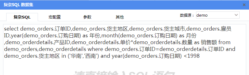 第一个数据集ds1从产品自带演示数据库中的“演示订单表”和“演示订单明细表”取数,与报表示例【纵向分片报表】中的差别是,数据集中增加了一个“演示_订单明细表”的“产品ID”字段,数据集sql语法如下: