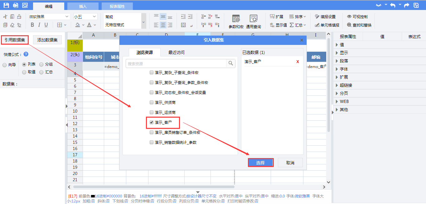 报表中的数据来自产品中自带的数据集“演示 客户”。点击【引入数据集】按钮,在引入数据集页面,找到并勾选数据集“演示 客户”,点击【选择】按钮。