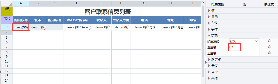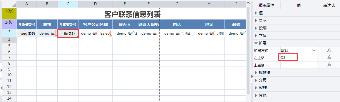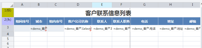 在相应单元格设置对应取数表达式如下: B3单元格的表达式为:=demo客户.Group(城市,false) D3单元格的表达式为:=demo客户.Select(客户名称) E3单元格的表达式为:=demo客户.联系人 F3单元格的表达式为:=demo客户.联系人职务 G3单元格的表达式为:=demo客户.电话 H3单元格的表达式为:=demo客户.地址 I3单元格的表达式为:=demo_客户.邮政编码