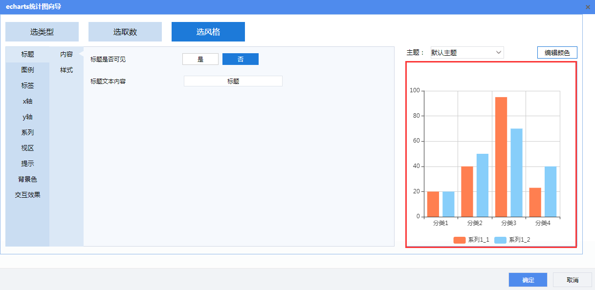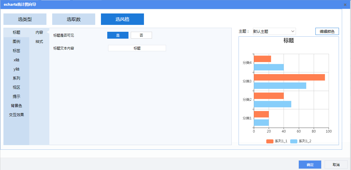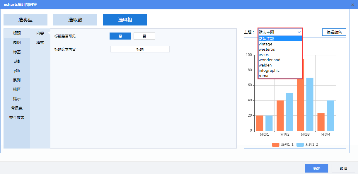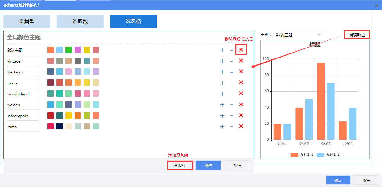 该页面除了可以设置统计图的各个属性外,还可以设置主题,系统提供了8种主题供用户使用,如下图: