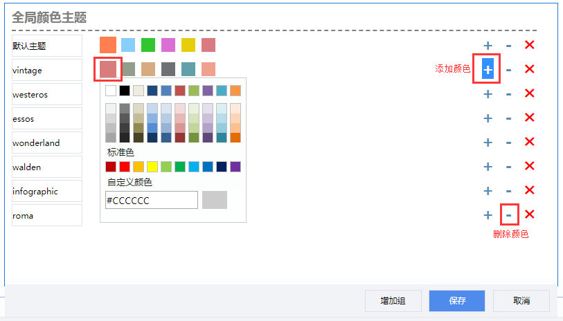 此外,点击【编辑颜色】按钮可以打开 全局颜色主题 页面,在该可以添加、修改、删除颜色组。