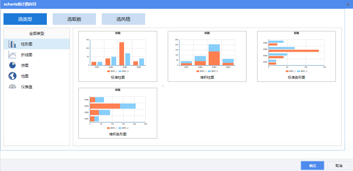 基于产品提供的向导,统计图的设置经过“选类型 -> 选取数 -> 选类型”三个步骤即可完成。其中,选取数、选风格两个环节之间可自由切换调试。但如果从后两个环节又返回“选类型”环节进行了统计图类型修改时,将有可能自动清除“选取数”中已进行设置,因为不同统计图类型的取数结构可能不一样。