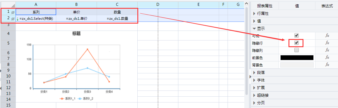 若报表展示时不需要显示数据,则设置第一行和第二行隐藏。