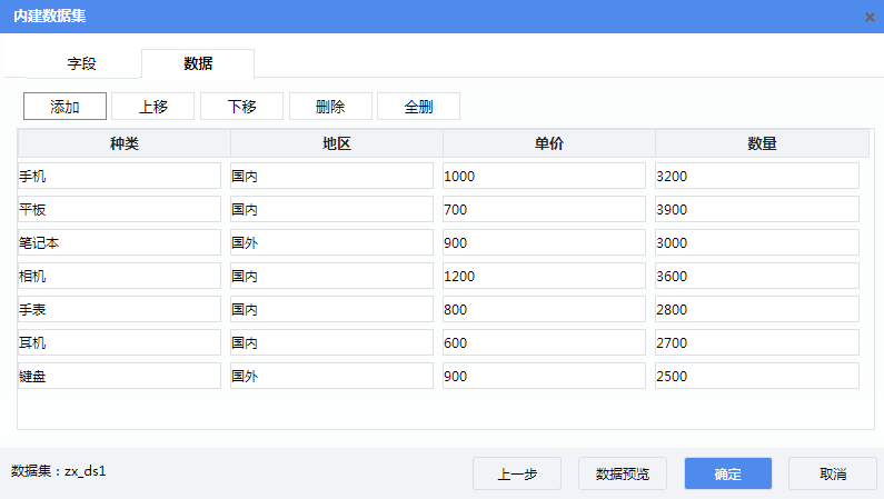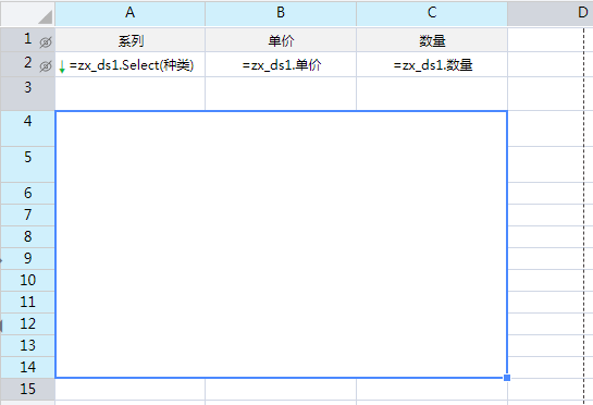 A2单元格表达式为:=zx_ds1.Select(种类) B2单元格表达式为:=zx_ds1.单价 C2单元格表达式为:=zx_ds1.数量