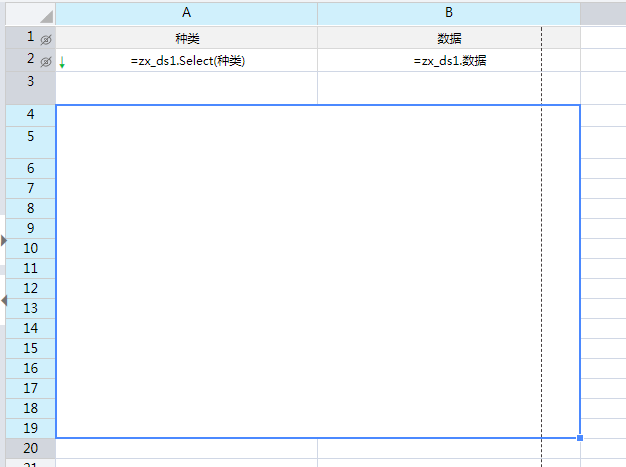 A2单元格表达式为:=bt_ds1.Select(种类) B2单元格表达式为:=bt_ds1.数据
