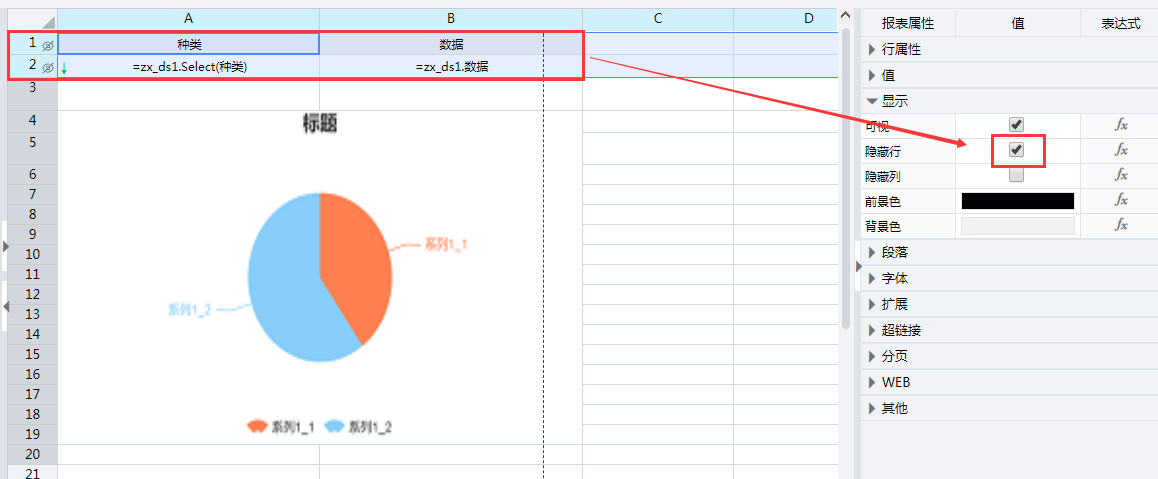 若报表展示时不需要显示数据,则设置第一行和第二行隐藏。