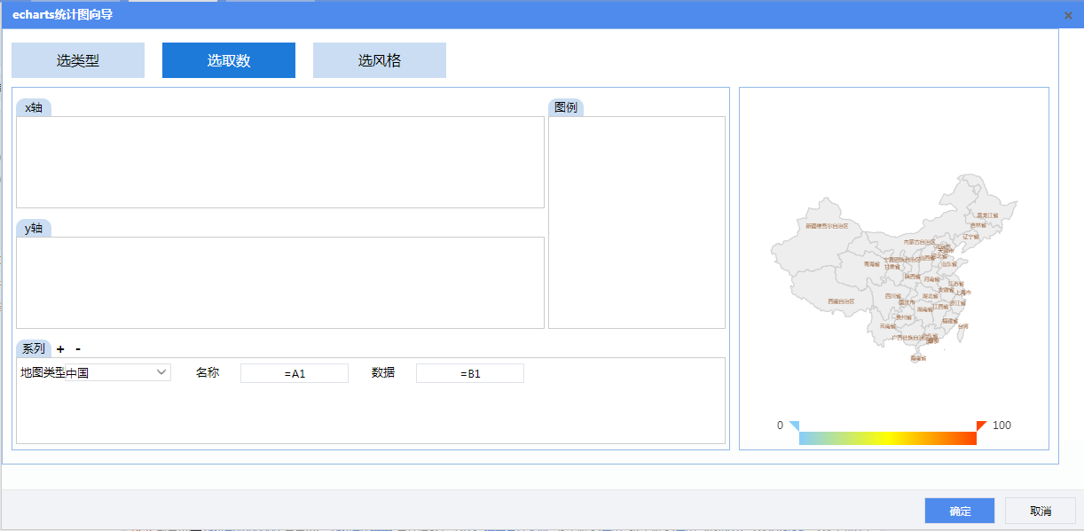 设置系列中地图类型为中国,名称为=A1,数值为=B1。