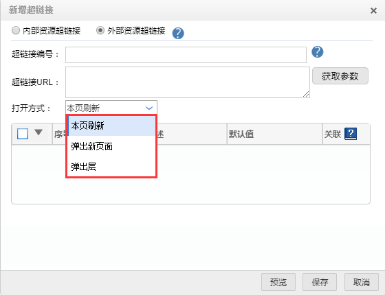 以带参数的外部资源超链接为例,详细介绍一下带参数的外部资源超链接的新建方法:
