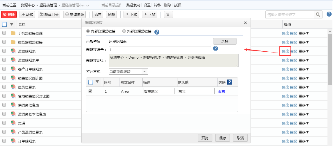 点击超链接资源名称后的【修改】按钮,可以修改超链接。