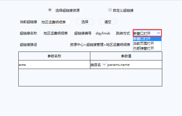 目前提供新窗口打开、当前页面打开和内部弹窗打开三种方式,默认选择为本新窗口打开。