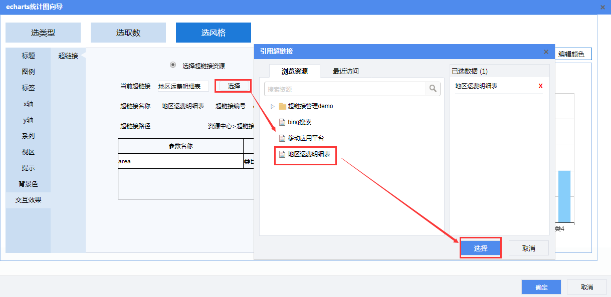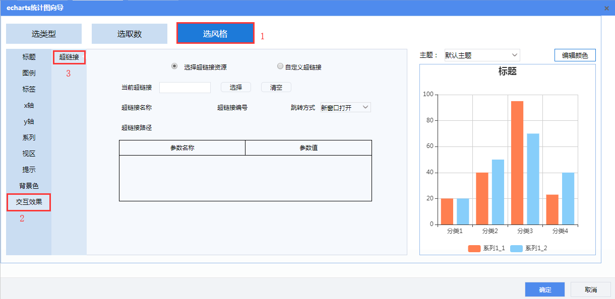 统计图设置向导中“选风格”页面 【交互效果】下可以添加超链接。