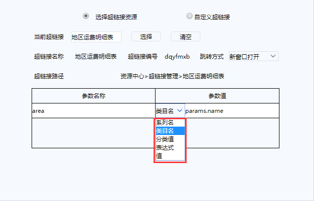 统计图中超链接设置也分为选择超链接资源和自定义超链接两种。使用方法和报表中使用超链接类似。下面介绍统计图中超链接的设置方法。
