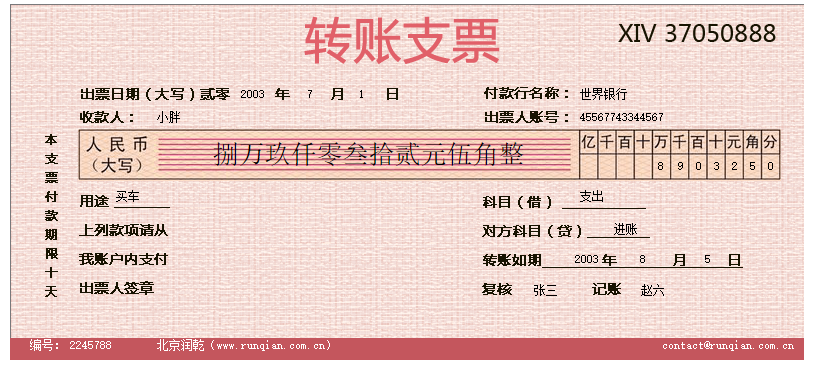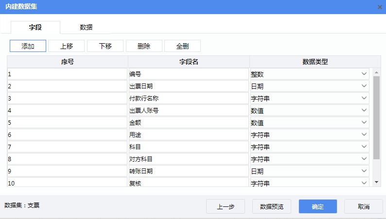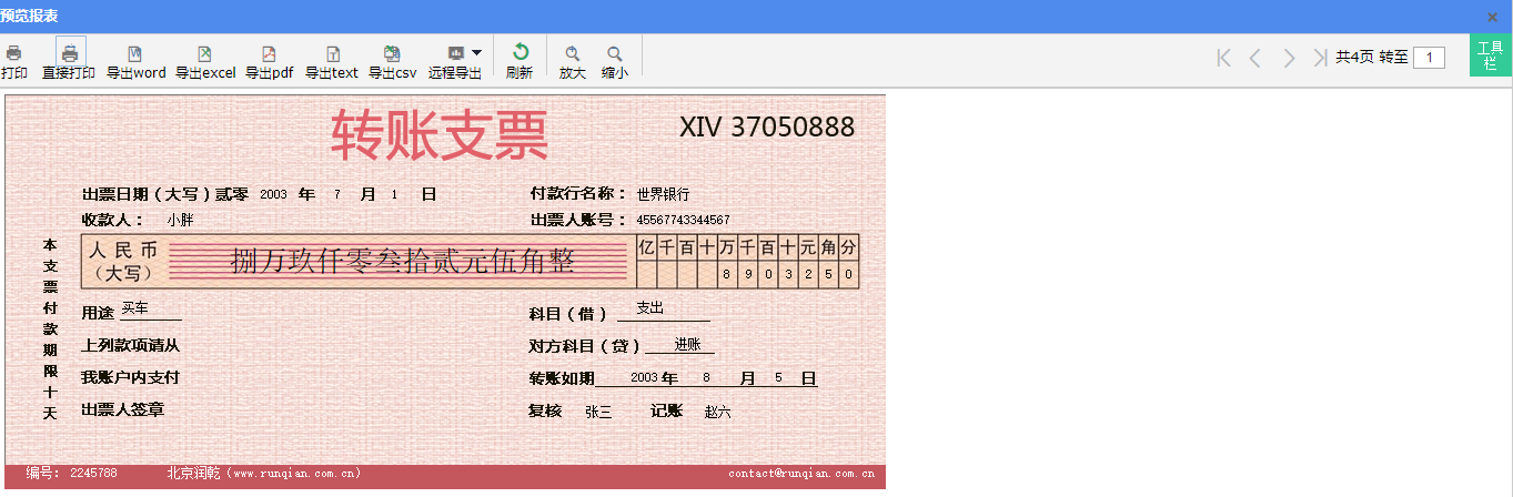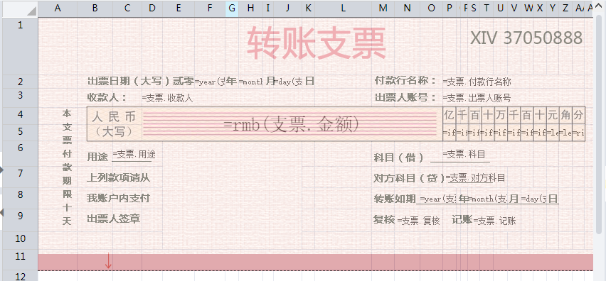 设置单元格表达式: F2:=year(支票.出票日期) H2:=month(支票.出票日期) J2:=day(支票.出票日期) P2:=支票.付款行名称 D3:=支票.收款人 P3:=支票.出票人账号 D4:=rmb(支票.金额) P5:=if(len(str(支票.金额))>11,left(right(str(支票.金额),12),1),””) Q5:=if(len(str(支票.金额))>10,left(right(str(支票.金额),11),1),””) S5:=if(len(str(支票.金额))>9,left(right(str(支票.金额),10),1),””) T5:=if(len(str(支票.金额))>8,left(right(str(支票.金额),9),1),””) U5:=if(len(str(支票.金额))>7,left(right(str(支票.金额),8),1),””) V5:=if(len(str(支票.金额))>6,left(right(str(支票.金额),7),1),””) W5:=if(len(str(支票.金额))>5,left(right(str(支票.金额),6),1),””) X5:=if(len(str(支票.金额))>4,left(right(str(支票.金额),5),1),””) Y5:=left(right(str(支票.金额),4),1) Z5:=left(right(str(支票.金额),2),1) AA5:=right(str(支票.金额),1) C6:=支票.用途 P6:=支票.科目 P7:=支票.对方科目 O8:=year(支票.转账日期) S8:=month(支票.转账日期) W8:=day(支票.转账日期) N9:=支票.复核 S9:=支票.记账