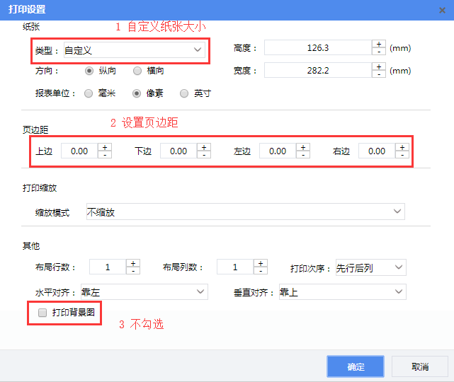 根据票据的实际尺寸自定义纸张的大小,同时将页边距都设为 0。其次不勾选打印背景图即可实现报表的套打。