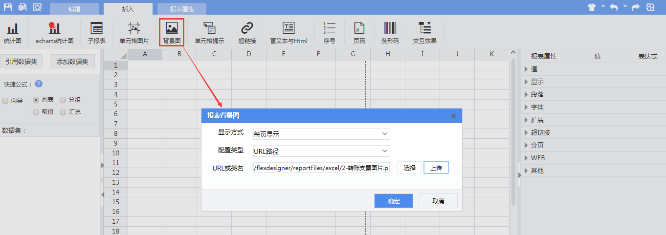 新建复杂报表,利用设计器工具栏中的【插入】—【背景图】对报表进行背景图的插入。