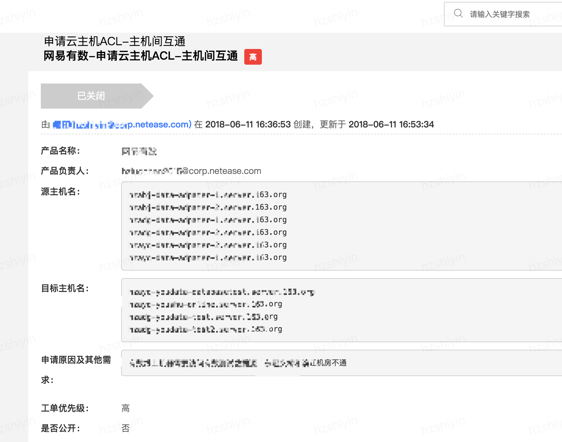 新建工单=>服务器类=>申请云主机ACL=>主机间互通,创建完成之后的工单标题是:”新建工单-申请云主机ACL-主机间互通”