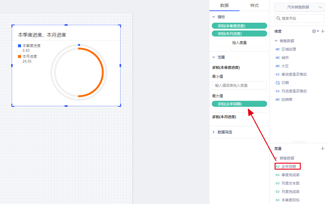 有时候用户需要与去年同期进行对比,则这时可以将度量字段拖入最大值。以另一个图表举例,需要设定去年同期的指标为一个目标值,即在最大值区域拖入“(求和)去年同期”字段,此时得分环的的最大值就是去年同期的数值,灰色部分代表去年同期目标值,可以清楚的对比出两者间的差距,如图: