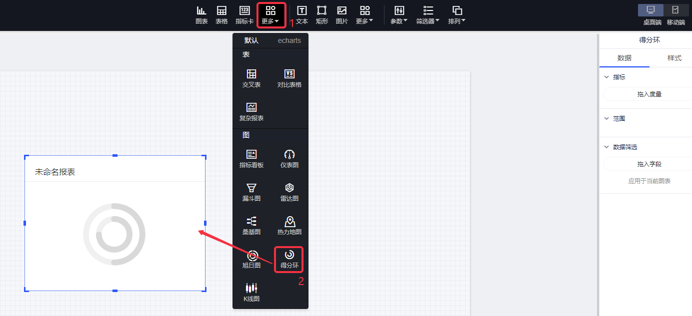 (3)为了能够使图像表达的含义更丰富,我们需要给得分环的每个指标分别定一个范围,可以更直观的查看当前值与最大值之间的差距,这个范围即可以是固定的,即手动输入一个范围;也可以是动态变化的,即拖入度量字段。