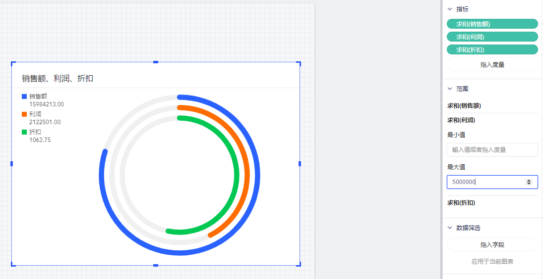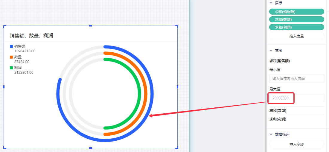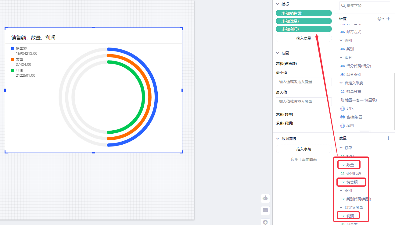 (2)将度量“销售额”“利润”“数量”拖入指标区域,代表我们希望在得分环中显示的动态变化指标,此时得分环中显示所有指标的一半;
