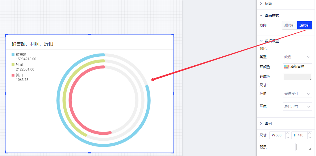 (5)您还可以在图表样式中选择顺时针或逆时针,如果不满意颜色或得分环的尺寸,可以对环底和环值分别进行设置。