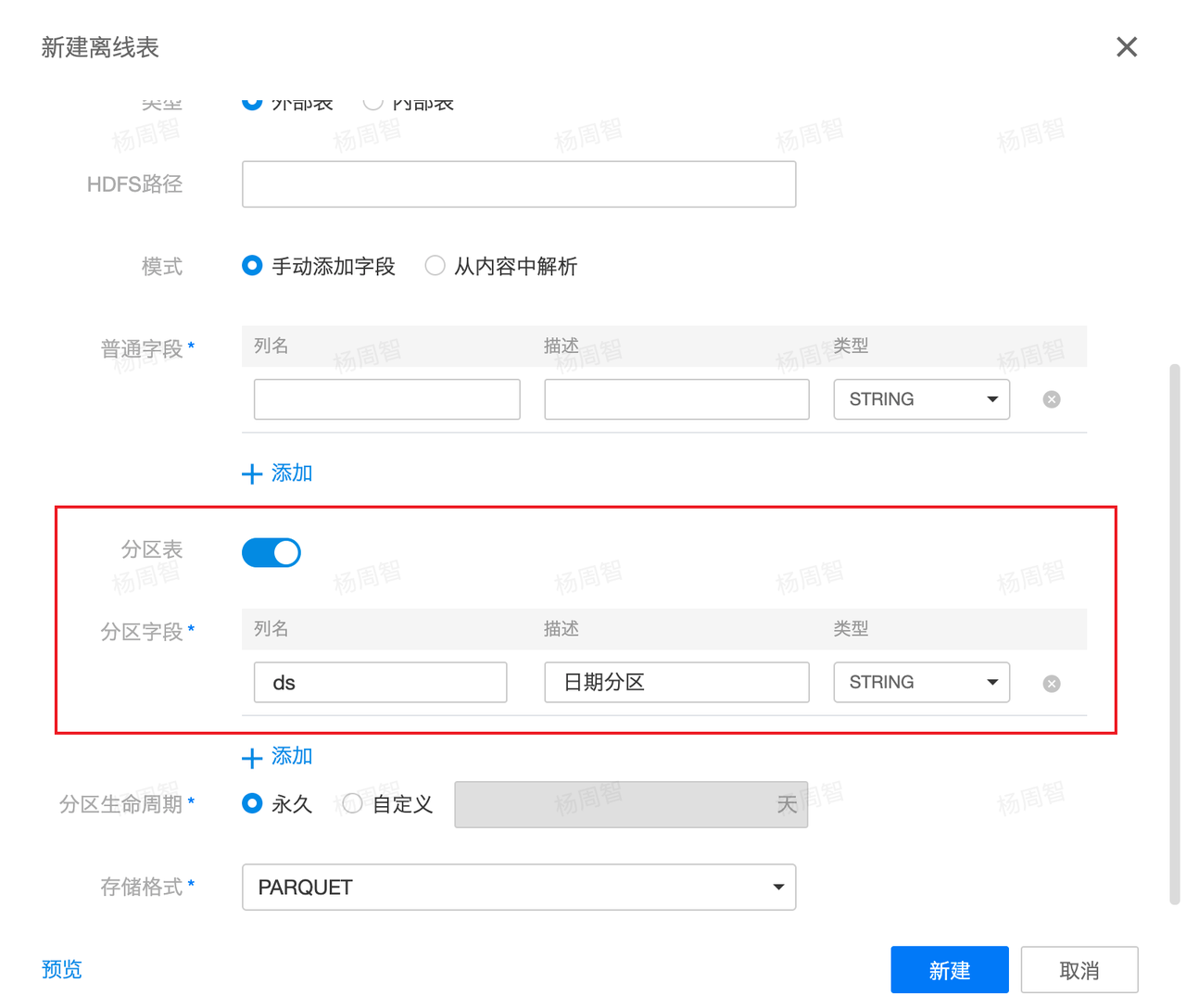 (1)在有数大数据平台数据管理新建离线表时,开启分区表选项,并设定分区字段