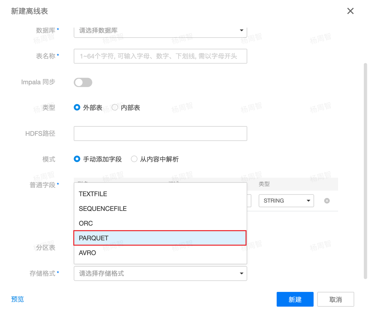 (1)在有数大数据平台数据管理中,新建离线表时,存储格式选择PARQUET