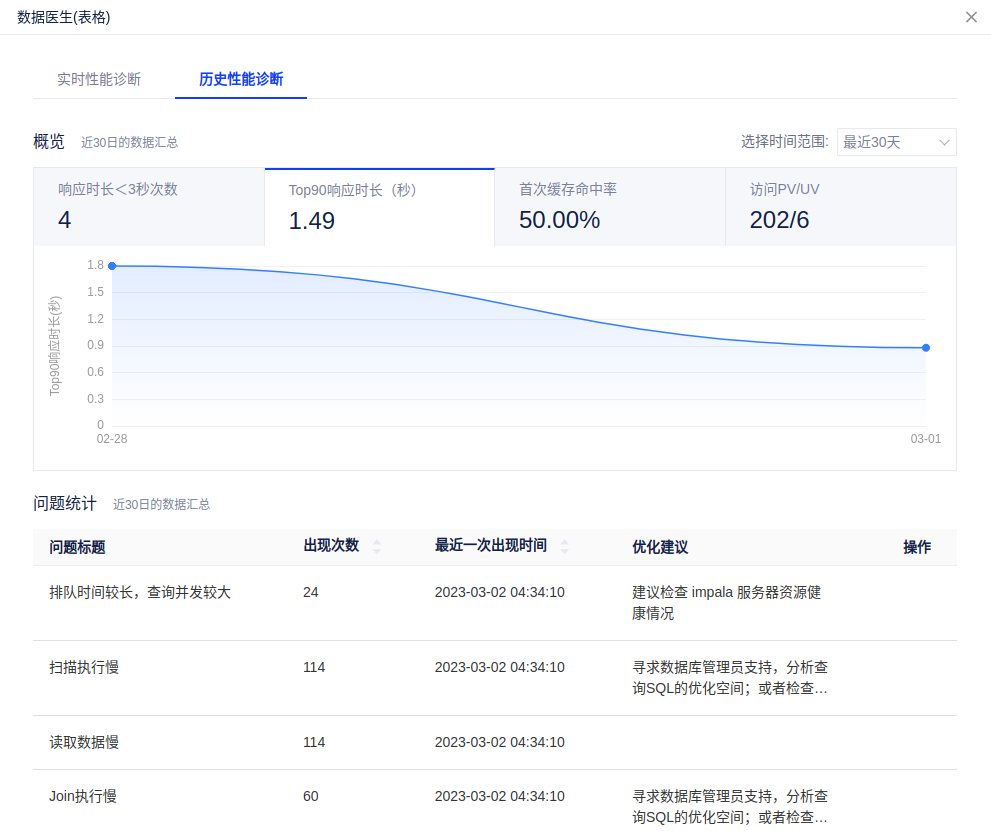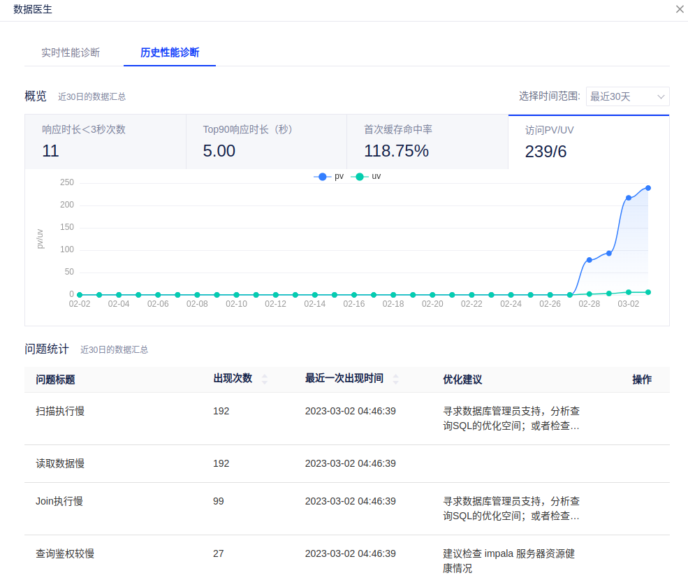 历史性能诊断:展示该组件近30日的性能数据汇总。支持设置时间范围:最近30天、最近7天、最近3天