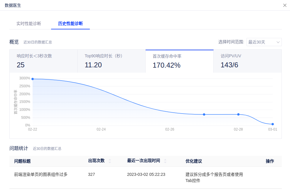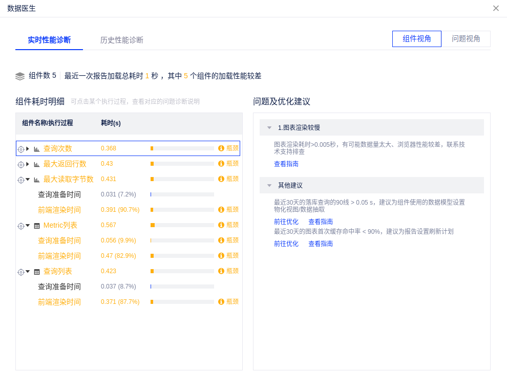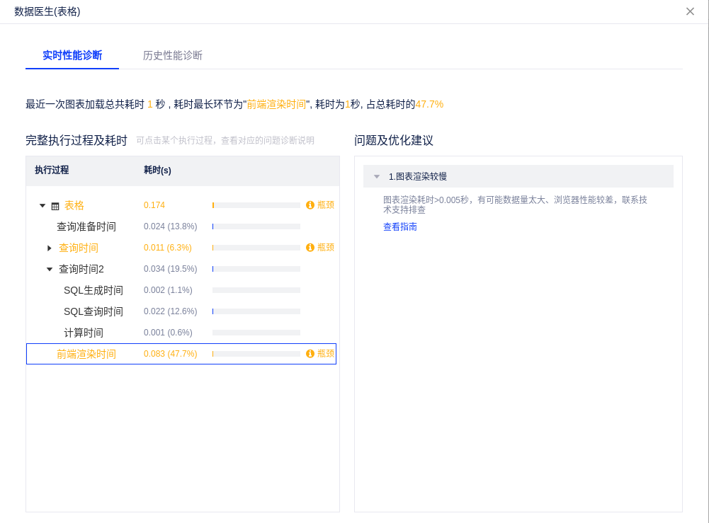 实时性能诊断:展示最近一次图表加载的耗时情况。选择某个过程,右侧会展示该过程存在的性能问题及优化建议