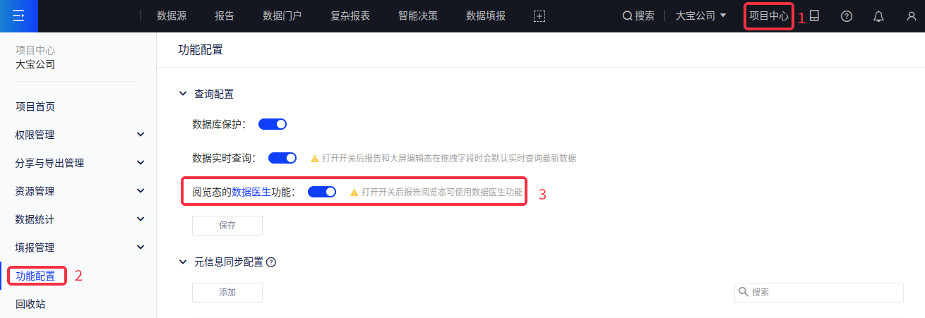数据医生功能支持编辑报告及阅览报告时使用,若不想让阅览用户使用数据医生功能,则需要项目管理员在项目中心-功能配置中,关闭【阅览态的数据医生功能】。