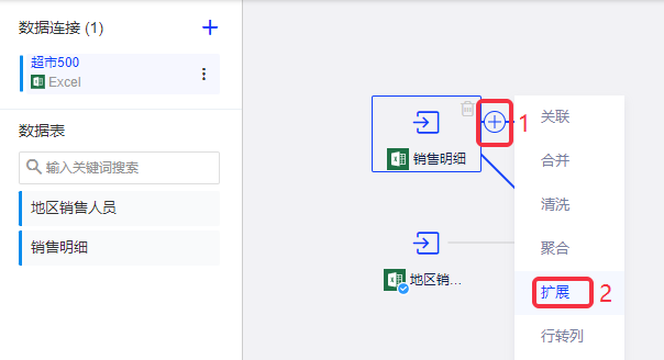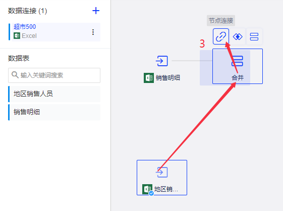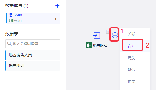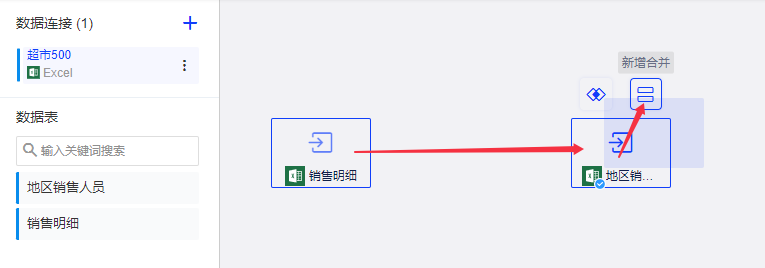 点击已有的表,弹出“+”按钮,点击按钮,选择“合并”,将要合并的表拖入合并节点,建立两张表的合并关系。