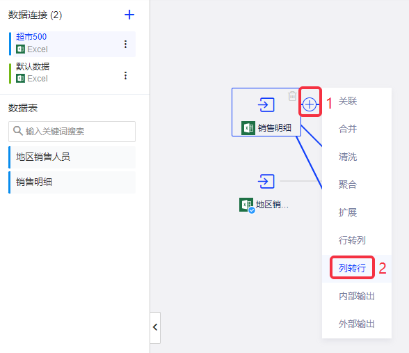 将表中同一个值对应的多个列,转换为多行数据。点击已有的表,弹出“+”按钮,点击按钮,选择“列转行”。