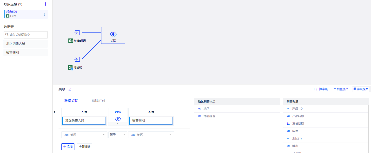 - 内关联:生成的表将包含与两个表均匹配的值。 - 左关联:生成的表将包含左侧表中的所有值以及右侧表中的对应匹配项。当左侧表中的值在右侧表中没有对应匹配项时,将在数据视图中看到null值。 - 右关联:生成的表将包含右侧表中的所有值以及左侧表中的对应匹配项。当右侧表中的值在左侧表中没有对应匹配项时,将在数据视图中看到null值 - 外关联:生成的表将包含两个表中的所有值。当任一表中的值在另一个表中没有匹配项时,将在数据视图中看到null值。两个关联的表中如果有相同的字段,将自动对字段进行重命名。