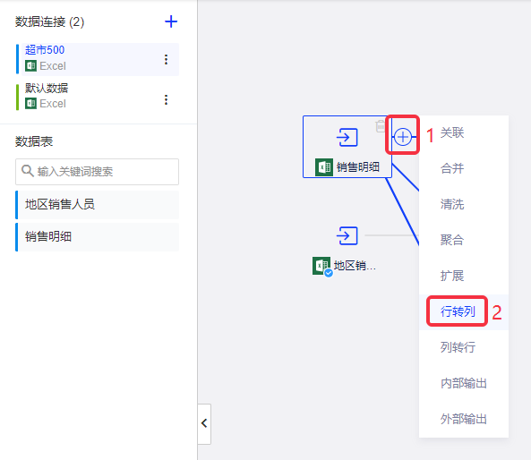 将表中具有相同值的多行数据转换成一个值的多列数据。点击已有的表,弹出“+”按钮,点击按钮,选择“行转列”。