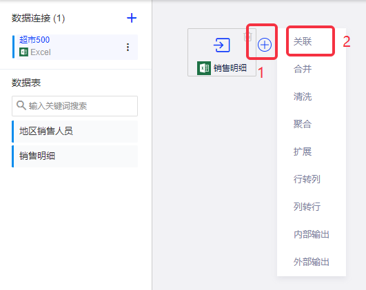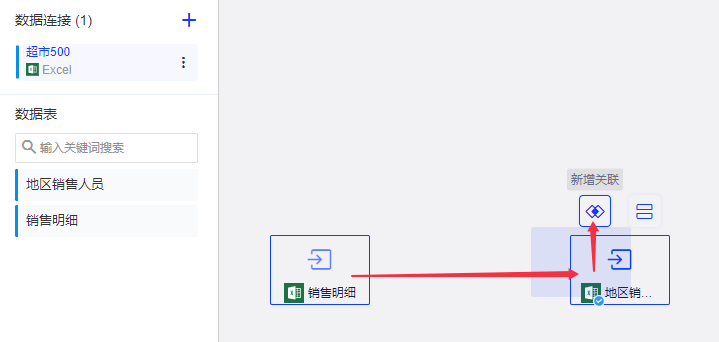 点击已有的表,弹出“+”按钮,点击按钮,选择“关联”,将要关联的表拖入关联节点,建立两张表的关联关系。