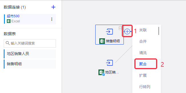 根据选定的维度,在指定的度量上做数据汇总或平均。点击已有的表,弹出“+”按钮,点击按钮,选择“聚合”。