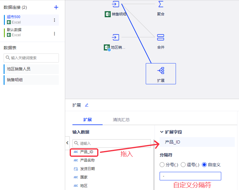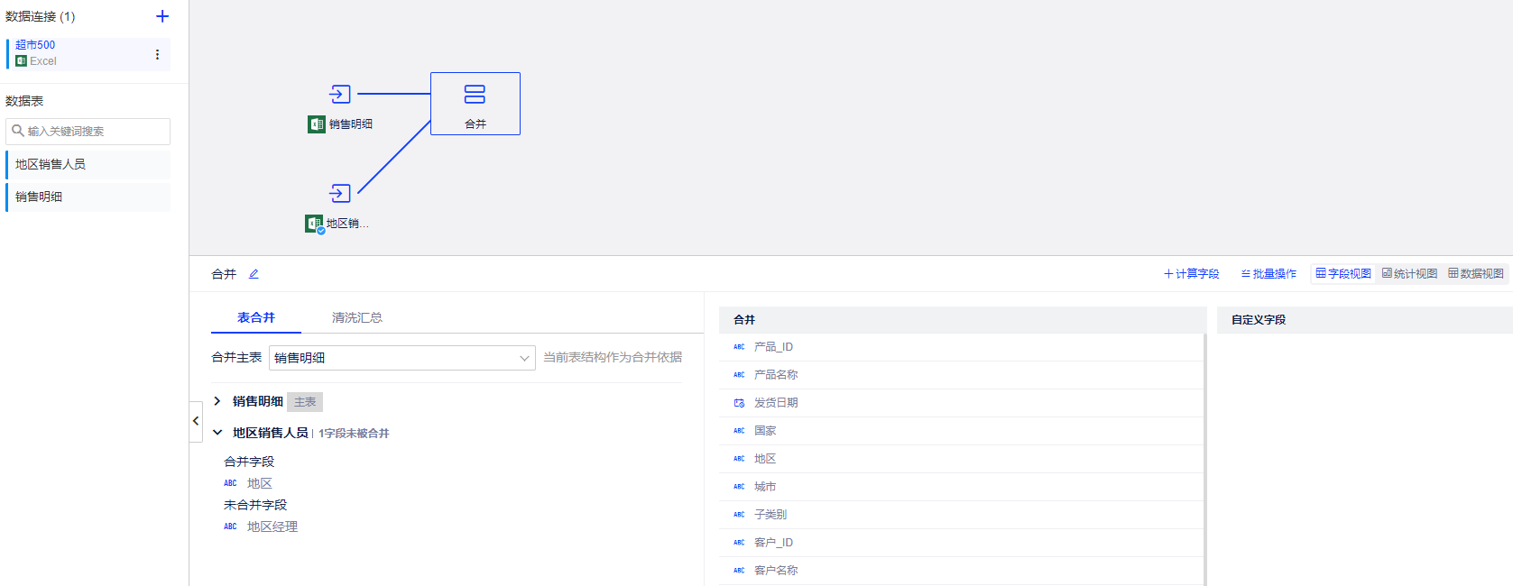 将要合并的表直接拖入已有的表中,选择合并的图标,建立两张表的合并关系。