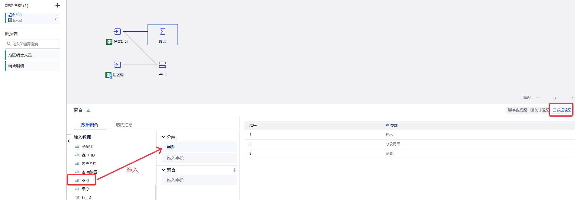 分组:拖入字段,数据视图中将根据字段进行分组展示。