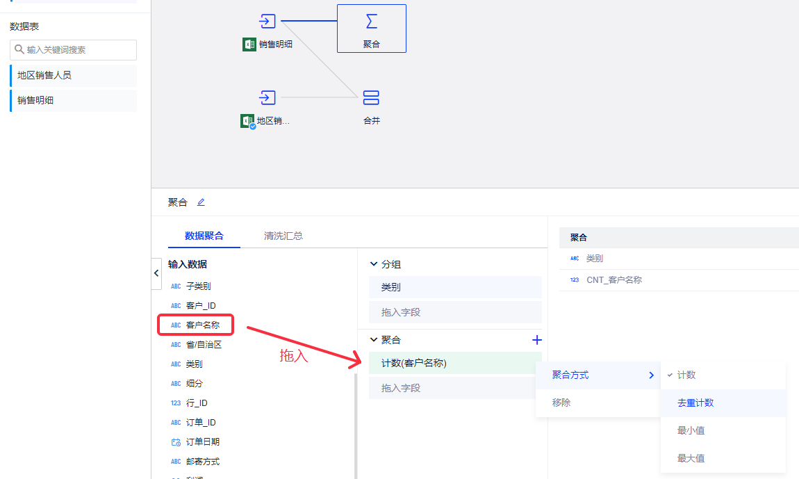- 拖入维度字段时,可供选择的聚合方式包括计数和去重计数;