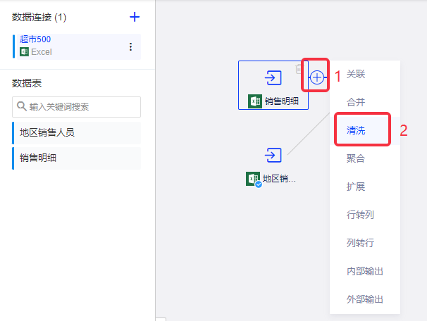 去掉数据表中不需要的列和行,并新增需要的列和行。点击已有的表,弹出“+”按钮,点击按钮,选择“清洗”。