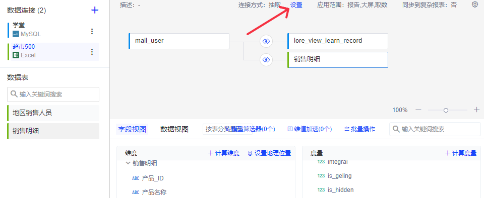 本产品支持将不同库(数据连接)中的表进行关联,比如一张数据表来自MySQL数据库,另一张数据表来自Excel文件,要将两张数据表关联成一张宽表后分析。此时需要将不同库(数据连接)的表抽取至MPP数据库中。