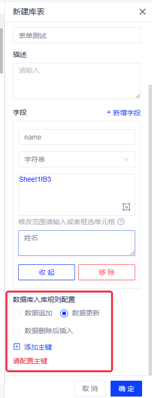 (2)数据库入库规则配置:目前支持3种入库规则:数据追加、数据更新和数据删除后插入