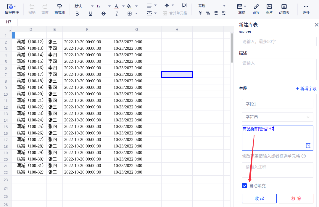 - 字段:点击新增字段,用户可以向库表内新增字段。可以自定义字段的名字、类型和范围。选择字段范围时,可以选择单个单元格,或连续的多行、多列,如Sheet1!A2:B6 。