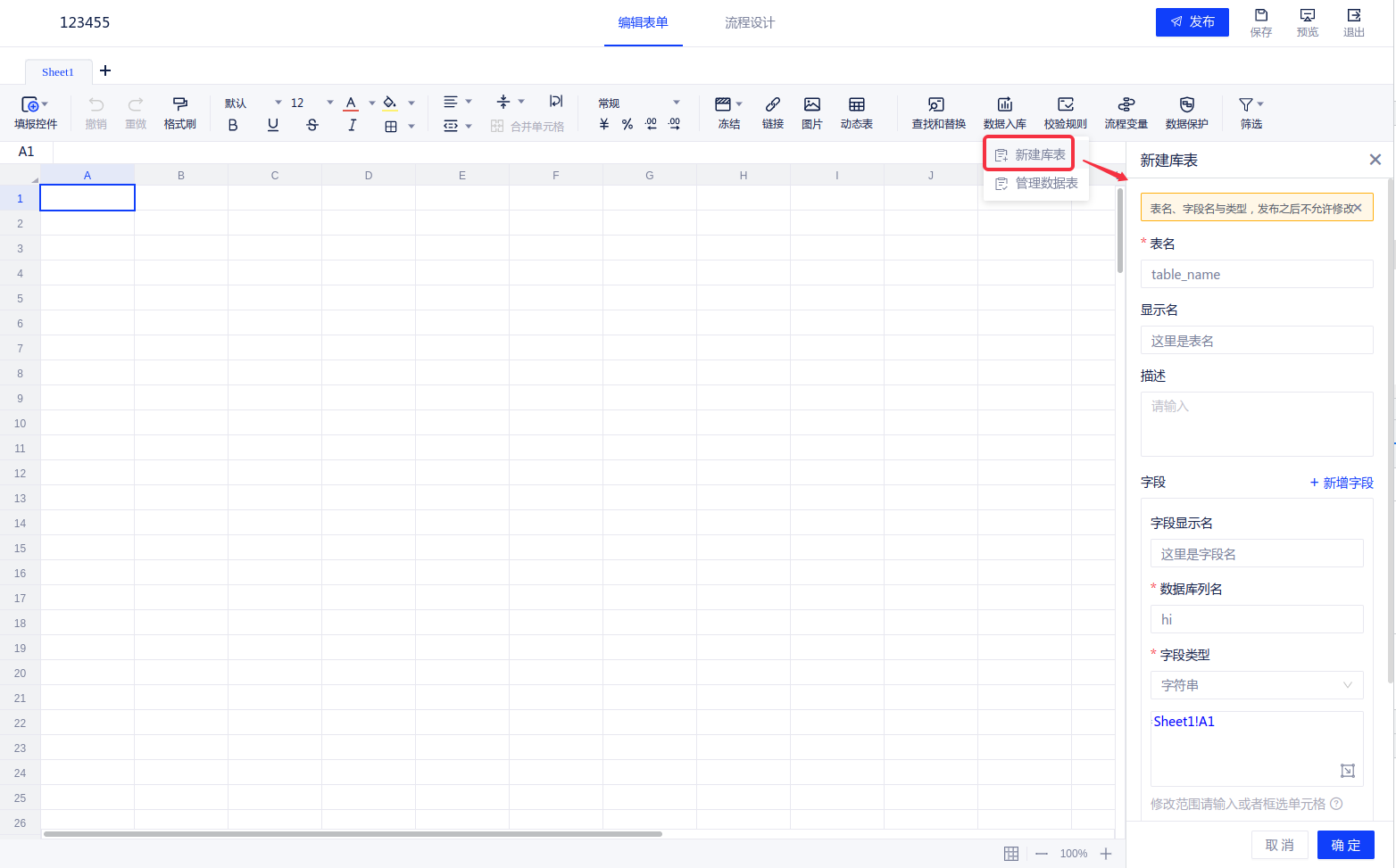 (1)在表单编辑页面,点击[数据入库-新建库表],即可新建一张该填报的写入表
