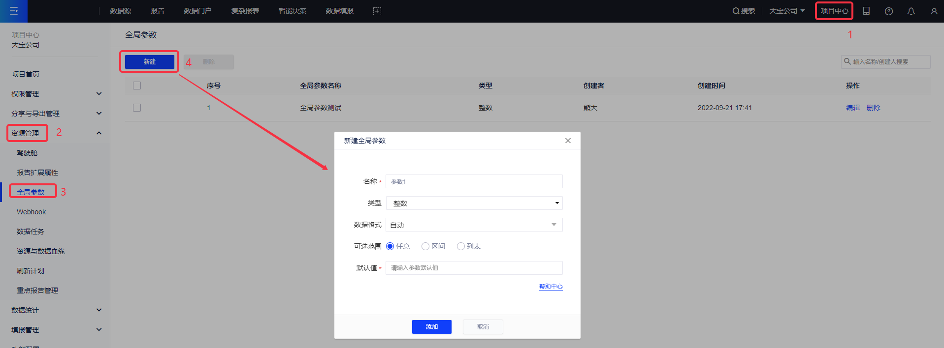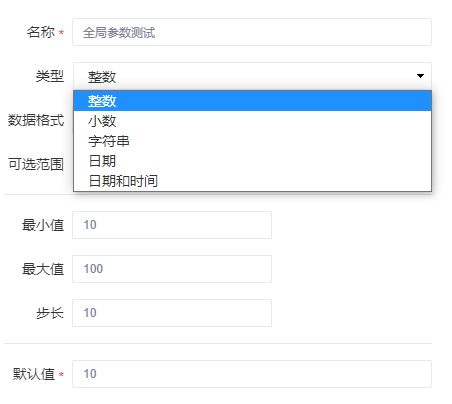 (3)与报告参数一致,全局参数目前支持类型包括整数、小数、字符串、日期、日期和时间;数据格式可选自动、数值和百分比;可选范围包括任意、区间和列表。