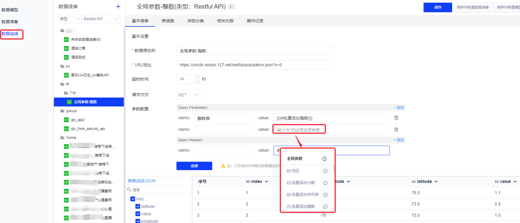 (2)数据源为Restful API时,参数配置中的value值支持引用全局参数,输入#可引用全局参数,下拉中展示当前用户拥有查看权限的参数列表,点击参数右侧icon可查看对应参数设置详情;