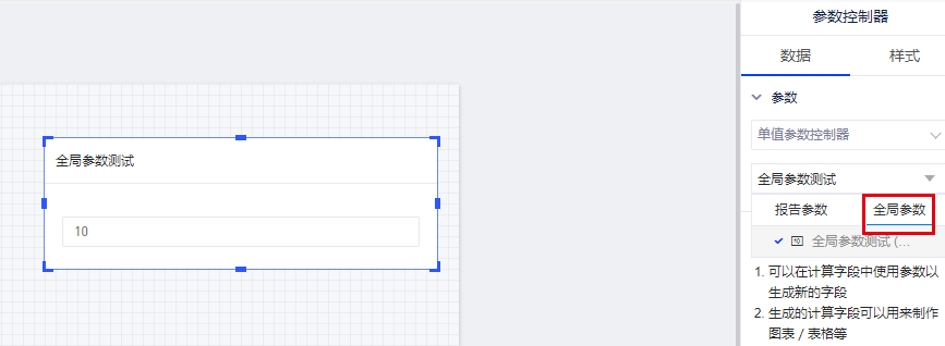 (1)与报告参数用法一致,您可在计算字段中使用参数,也支持参数控制器;
