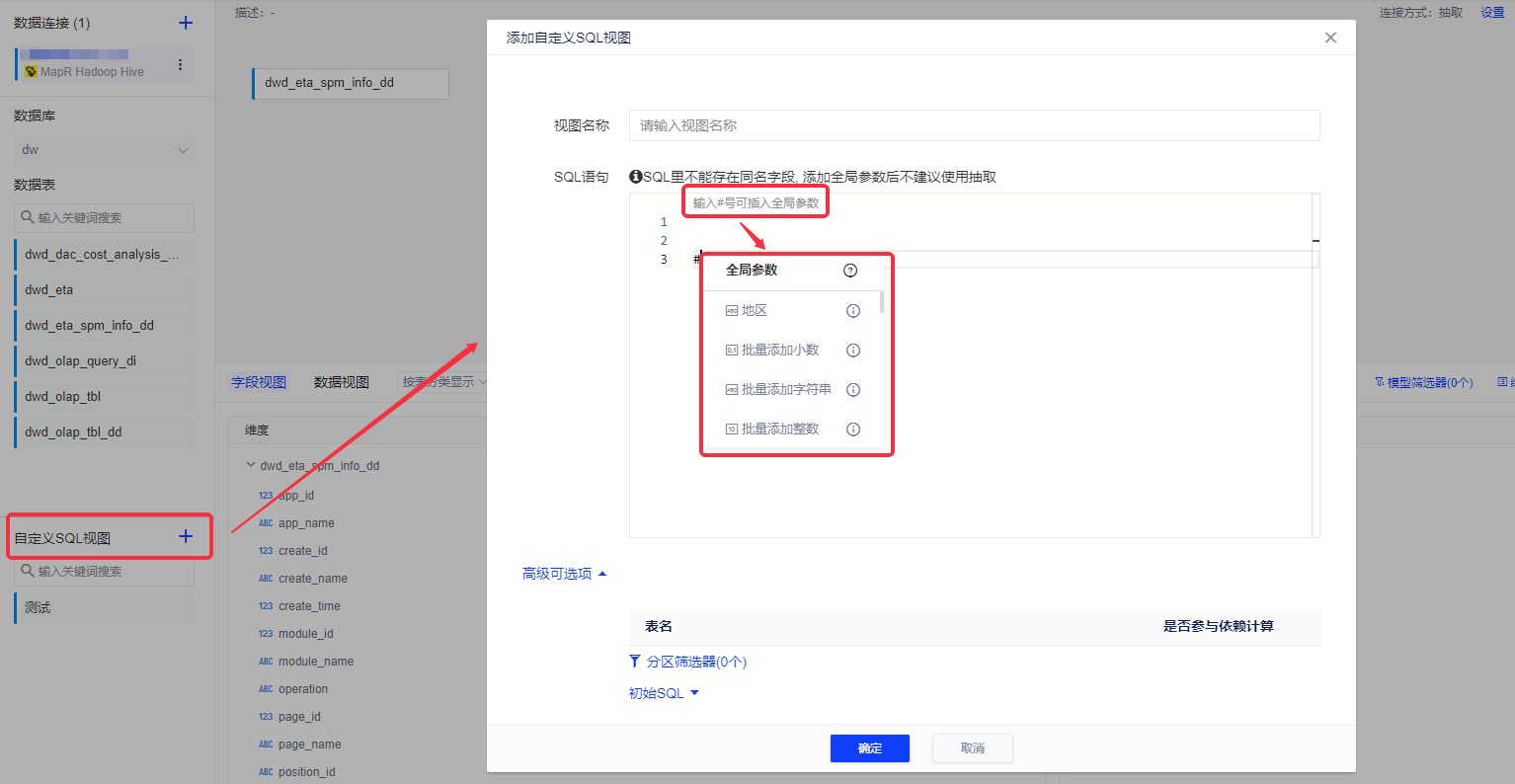 (3)数据模型设置页面,选择添加【自定义视图】时,SQL语句中使用#唤起全局参数的下拉框,若设置全局参数后不建议抽取。