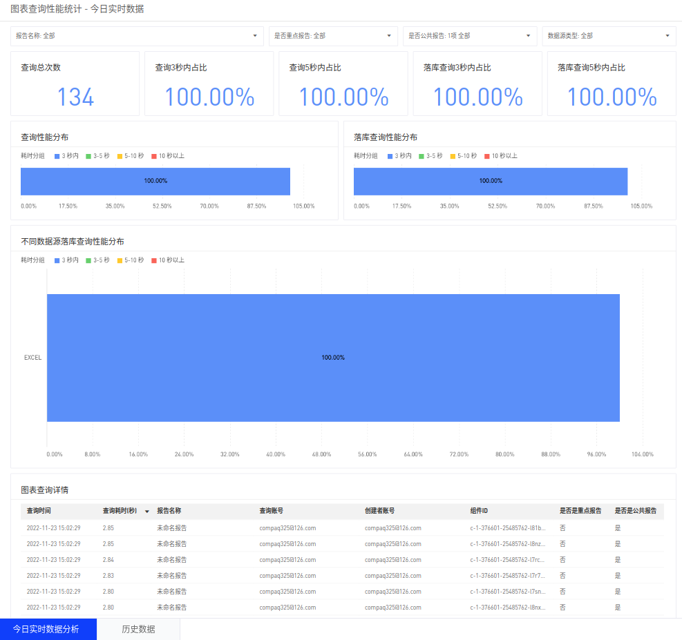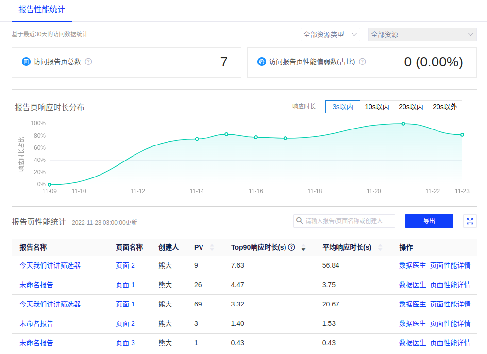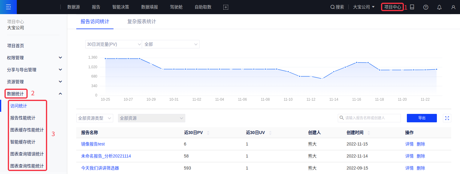 项目内的资源访问情况是每位数据生产者都关心的问题,本产品支持用户查看现有报告和图表的访问情况、性能统计等,为资源回收、性能优化提供数据依据。