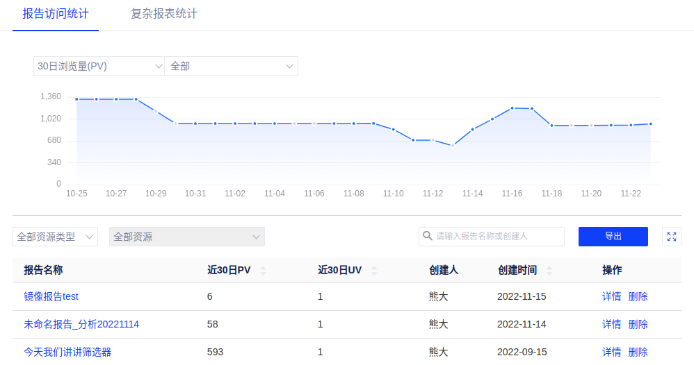 - 普通用户:只能看到且默认展示自己有可编辑权限的报告的访问统计。